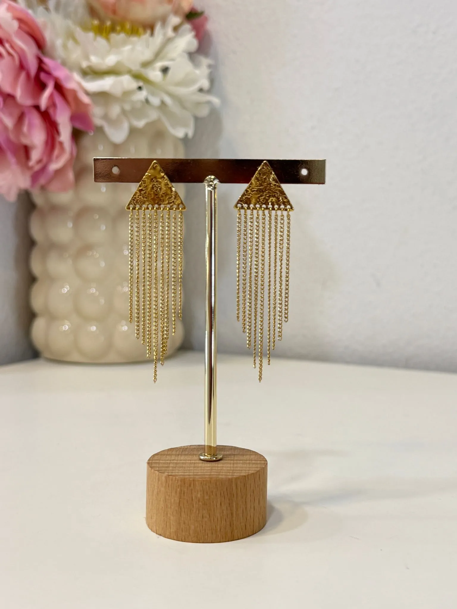 Su diseño alargado estiliza el rostro y añade un toque sofisticado y llamativo, ideal para ocasiones especiales o para elevar un look sencillo. El juego entre la forma estructurada del triángulo y la fluidez de las cadenas crea un equilibrio visual muy atractivo.